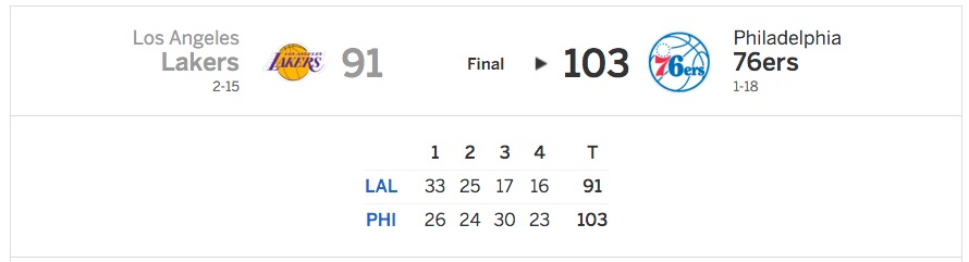 With the win, the 76ers avoided setting the mark for consecutive losses to start the season, which they had tied with their most recent loss. However, when you combine this year’s start with losing 10 consecutive games to end last season, the 76ers did set the record for most consecutive losses in any of the four major professional sports, at 28 games.
