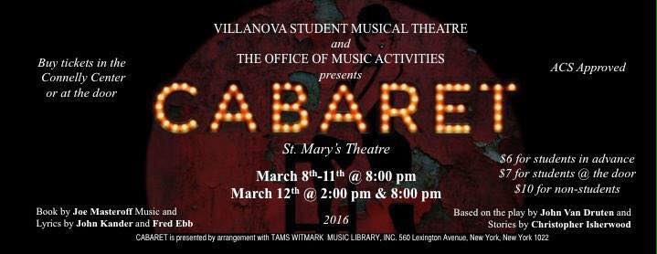 My wife, son, and I went to see the Villanova Student Musical Theater (VSMT) group’s production of Cabaret tonight, and it was outstanding. Let me offer my congratulations and thanks to all the cast members and crew for all the time and talent you devoted to such a project. My guess is that it was a labor of love for all of you.
