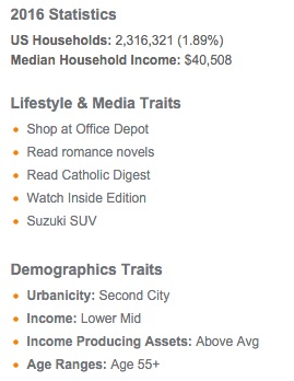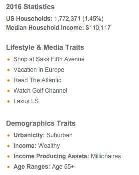 What is interesting to note however, are the distinct differences between the two segments. First, there there is a significant difference in average incomes – $110,000 vs. $40,000. I also like how they paint a picture of someone in each segment, reducing people to a narrowly defined stereotype, such as “Oh, you’re the kind of guy who drives a Suzuki SUV, shops at Office Depot, reads romance novels and Catholic Digest, and watches Inside Edition.” What can I say, that describes me perfectly…