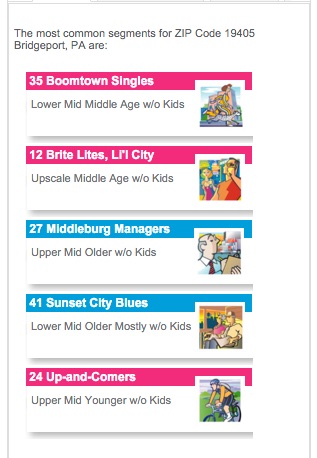 And by the way, I’m still searching for that zip code that has people with the following traits, “drives a 10 year old Toyota Matrix, reads any book that is available for free on the Kindle, reads Sports Illustrated at the local Barnes & Noble, bought last suit at thrift shop, shops at Mom’s Organic, lives a vegan lifestyle, watches Curb Your Enthusiasm and Nathan for You”.