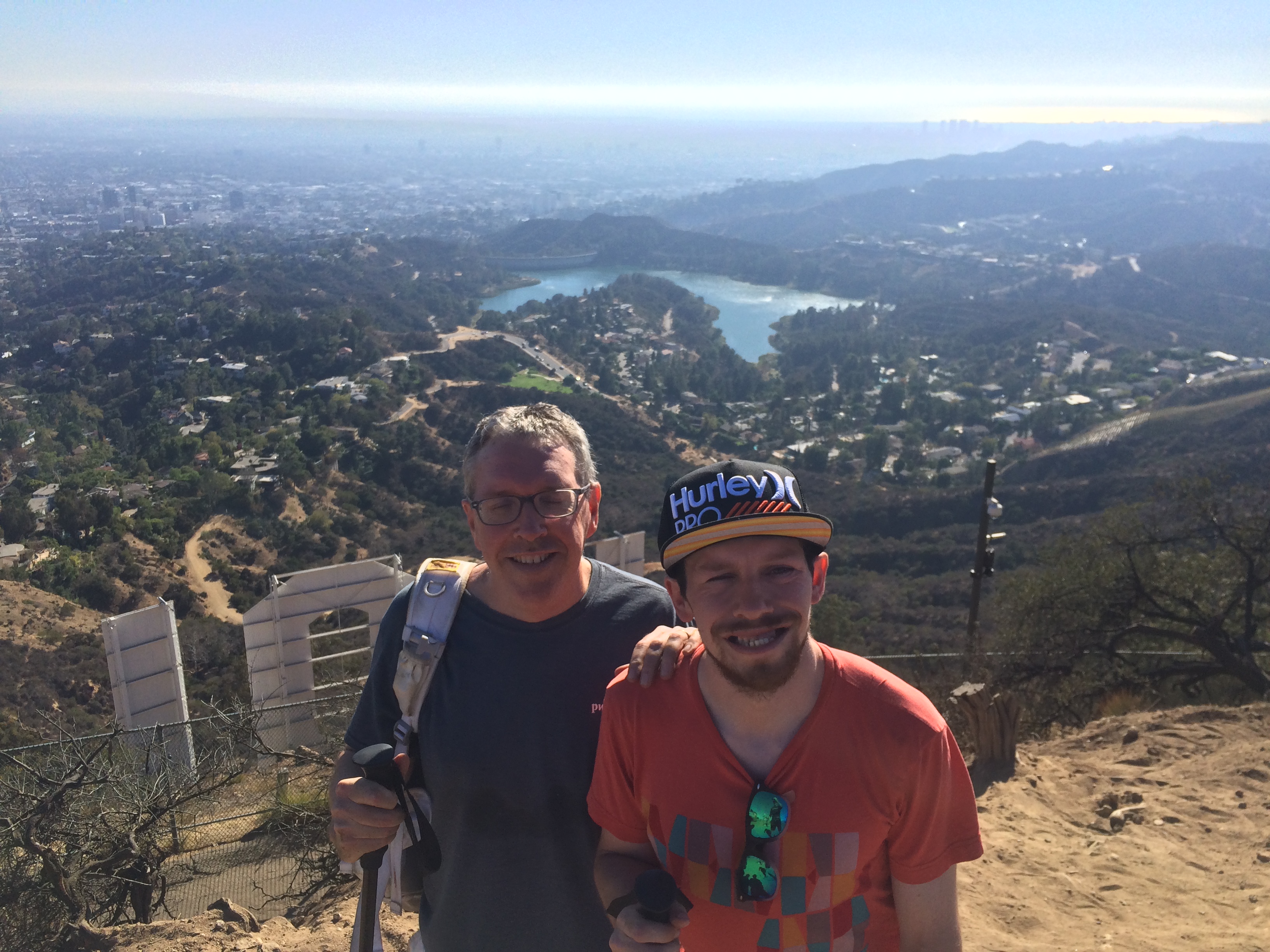 Here’s the view from the top, where we are behind the sign, and you can see Hollywood Lake in the background and the ocean even further away. This is where we sat down for a few minutes and had our lunch. It will take some getting used to when I go back to work and eat lunch while sitting behind a desk.