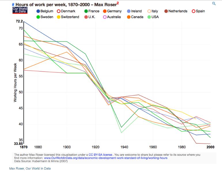 Blodget noted that over the past 150 years, humanity has collectively saved ourselves about 30 hours of work per week through our increased productivity. Here is the chart he used to support such a claim: