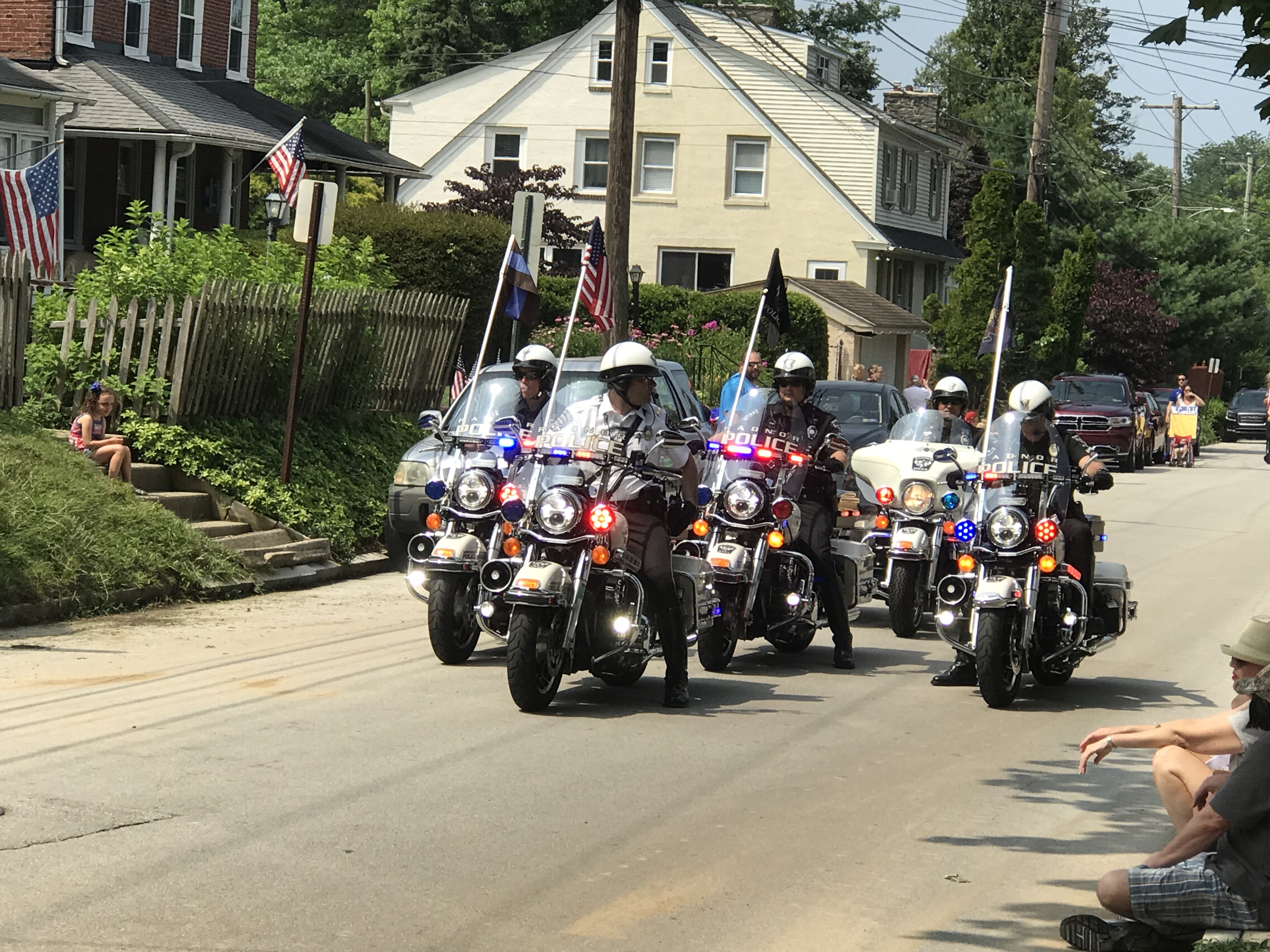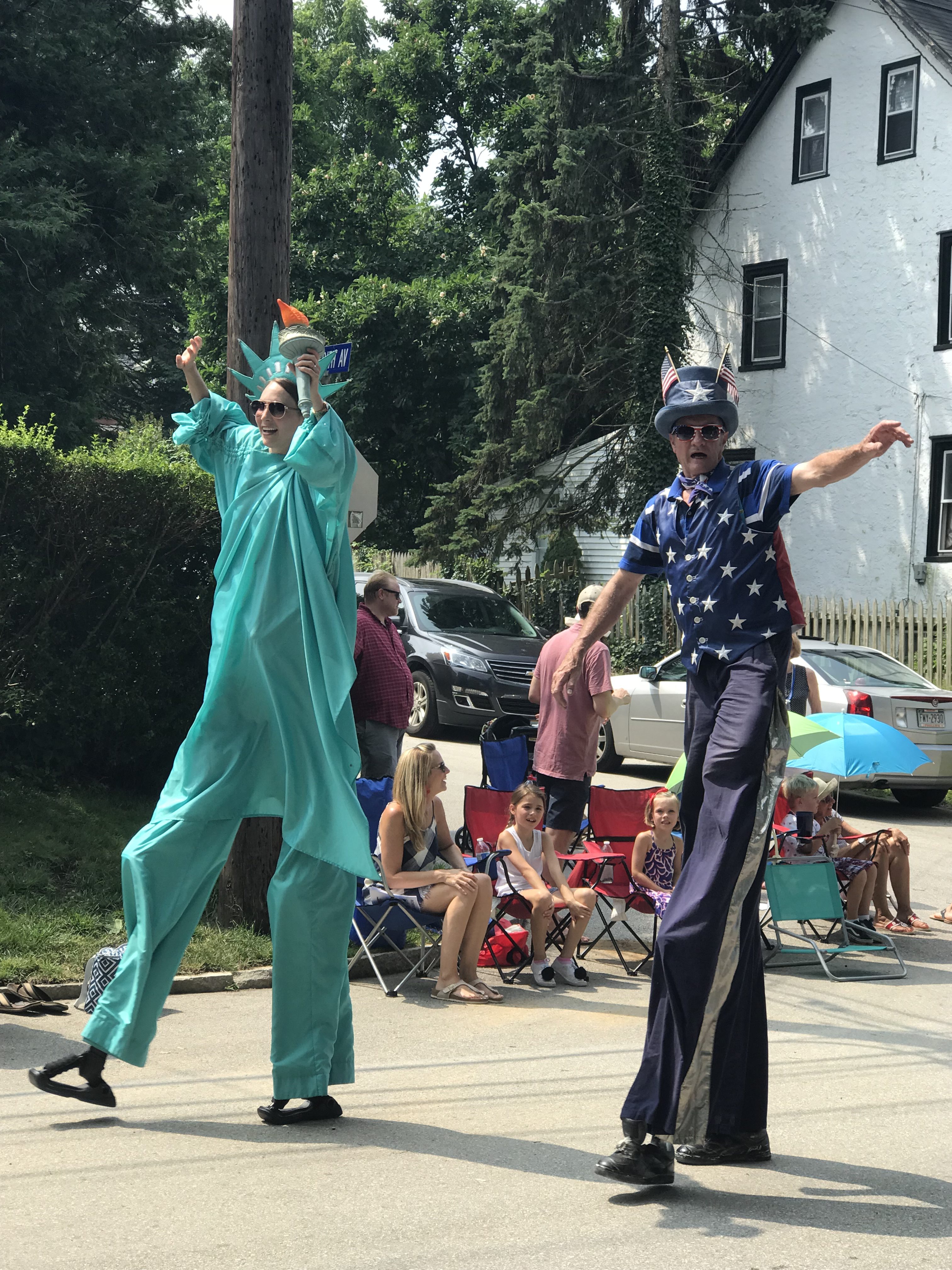 The parade is led by Radnor Township’s police motorcycle unit, and includes Uncle Sam and Lady Liberty, kids and their families, fire engines, and music, lots of music.