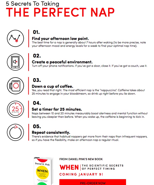 Dan Pink, of TED talk fame and a bestselling author, offers some tips on how to take an effective nap, which he calls a nappuccino. These tips come from his latest bestselling book, “When: the Scientific Secrets of Perfect Timing“.