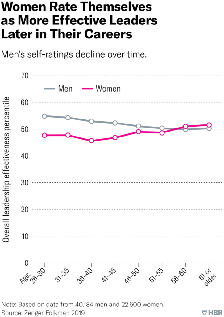 The researchers also looked at the trend in women’s perceptions of their overall leadership effectiveness, with their rating rising as they get older. Again, women at younger ages rate themselves significantly lower than men but their ratings climb — and eventually supersede those of men — as they get older.