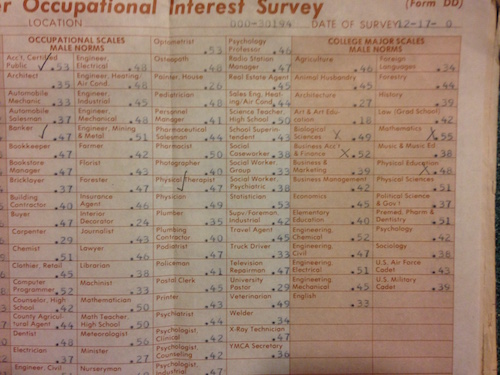 I was rummaging through some boxes of memorabilia and came across the results of my Kuder Occupational Interest Survey test from my senior year of high school, shown above. The survey shows results both for occupations and college majors that align most closely with the responses I gave to the survey questions. When I look … Continue reading High School Career Survey Turns Out Surprisingly Accurate 40 Years Later