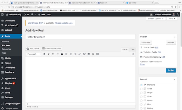 Those three words greet me each time I go to write my daily blog. Most days, it does not take me too long to figure out something to write about, but other days, like today, it is a struggle. I just sit and stare at the blank screen you see above, the blinking cursor taunting … Continue reading Add New Post