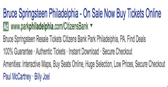 Take a close look at the screen shot above that shows the top result I got when I searched for Springsteen and Philadelphia. Do you notice anything new or different in this Google sponsored ad? Well today Google announced that it was changing the color of its ad tag that appears in search results, indicating … Continue reading Google Goes Green