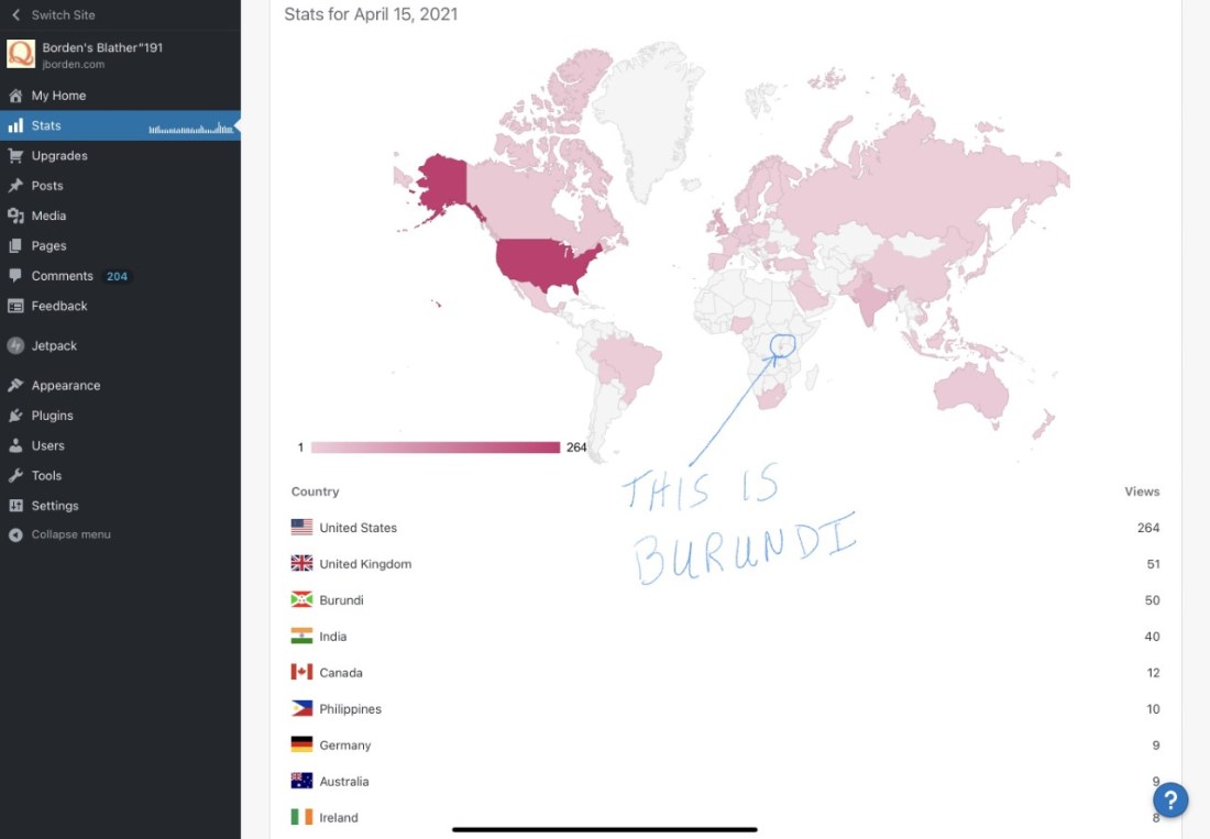 My name is Jim, and I look at my WordPress stats way too much. Part of the problem is that I have the WP app on my phone, and it is just so easy to check my stats when I've got a few free seconds. And it seems like I've got way too many "a … Continue reading Day One of WordPress Stats Detox Completed…